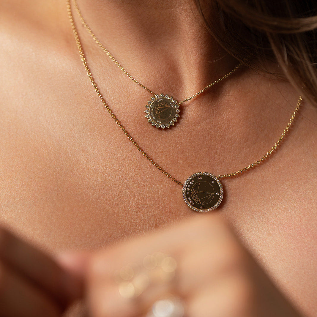 Each Birth Chart Necklace is a wearable map of your cosmic identity. Crafted in 14K gold and illuminated with ethically sourced, VS-quality diamonds, every piece is designed to reflect the exact planetary alignment at the moment of your birth. This is not symbolic jewelry. It is precise, personal, and entirely unique to you.