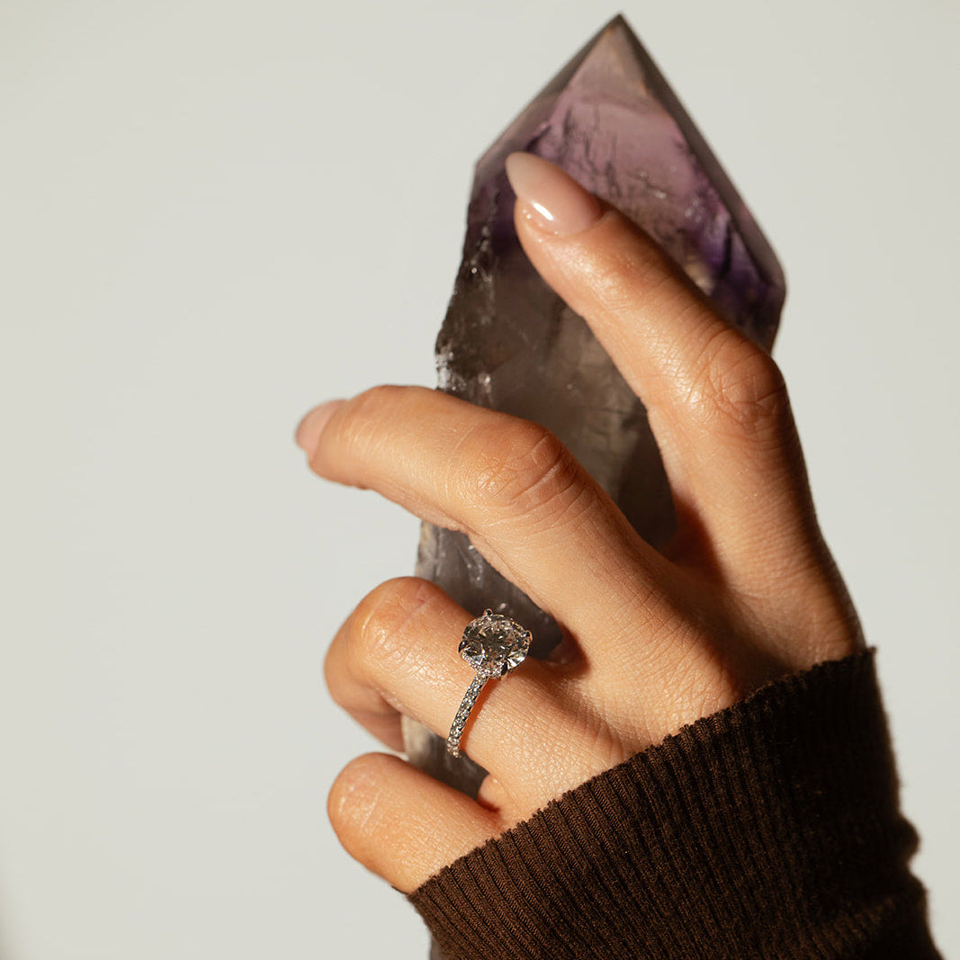 Timeless, elegant, and endlessly refined, The Jess is a classic solitaire engagement ring setting defined by its graceful low-profile silhouette, hidden halo, and three-quarter pavé diamond band. Designed to enhance the natural beauty of your center stone, this setting offers understated brilliance with a soft, romantic glow.